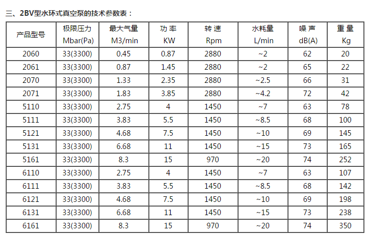 2BV系列真空泵適用于抽除氣體和水蒸氣,吸氣壓力可以達到33mbar絕壓(97%真空度)。當真空泵在吸氣壓力低于80mbar的狀態下長期工作時,應聯接氣蝕保護管,以對泵進行保護。如配大氣噴射器,吸氣壓力可達10mbar,噴射器可直接安裝在真空泵上。作為壓縮機用時,其壓力最大至0.26MPa(絕壓)