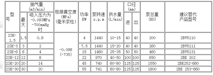 三、2SK系列水環式真空泵參數表: